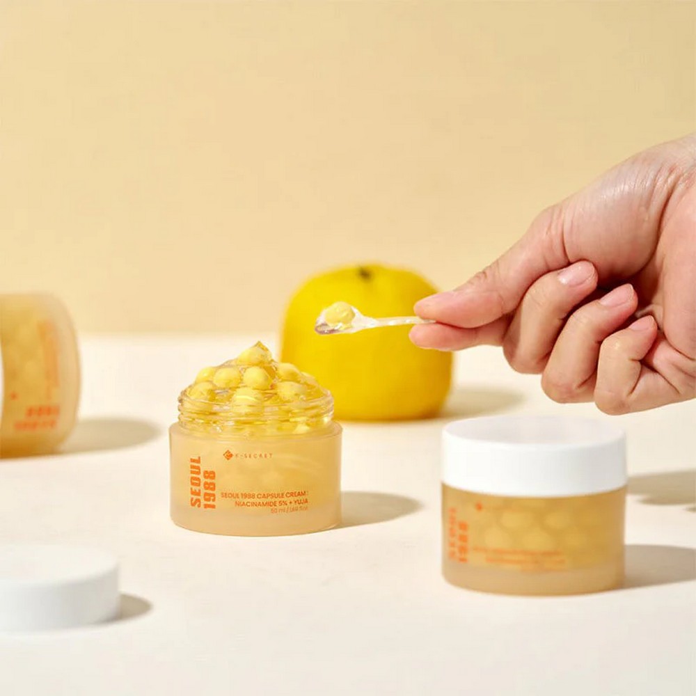 Αποκτήστε ομοιόμορφη και λαμπερή επιδερμίδα με την κρέμα κάψουλας K-SECRET – SEOUL 1988: Νιασιναμίδη 5% + Yuja . Αυτή η ελαφριά αλλά αποτελεσματική κρέμα κάψουλας συνδυάζει 5% νιασιναμίδη με εκχύλισμα yuzu (yuja) και καινοτόμο τεχνολογία κάψουλας. Το αποτέλεσμα είναι επιδερμίδα που αισθάνεται φρέσκια, ενυδατωμένη και αποκτά μια νέα λάμψη, όλα χωρίς να αφήνει βαριά αίσθηση.